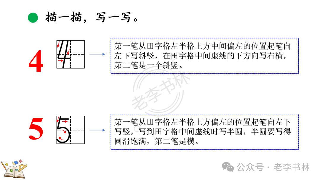 师:从这里开始起笔,你听明白了吗?不要封口。 师:最后我们看5呢?5也有两个箭头,先写哪一笔呢? 生5:先写左边的竖 师:接下来写什么呢?