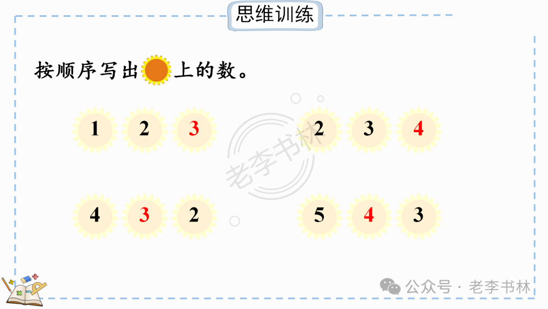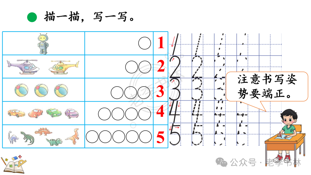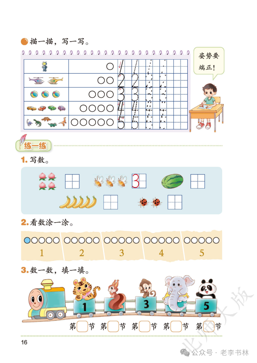 到第7页,看谁的拿书姿势最准确。我们看书的下半部。刚才我们已经数过了这些数,咱们来看这些数怎么写? 师:这个是竖1的写法对吗?