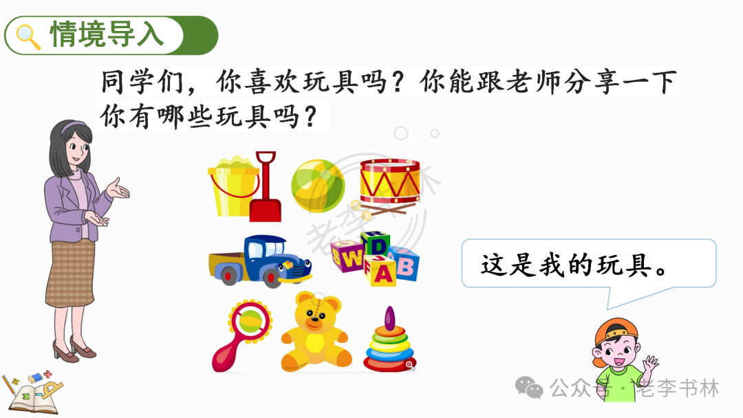 师:同学们说的很好,那么我们这节课就来学习玩具。 出示课题:《玩具》 师:板书 大屏幕:玩具