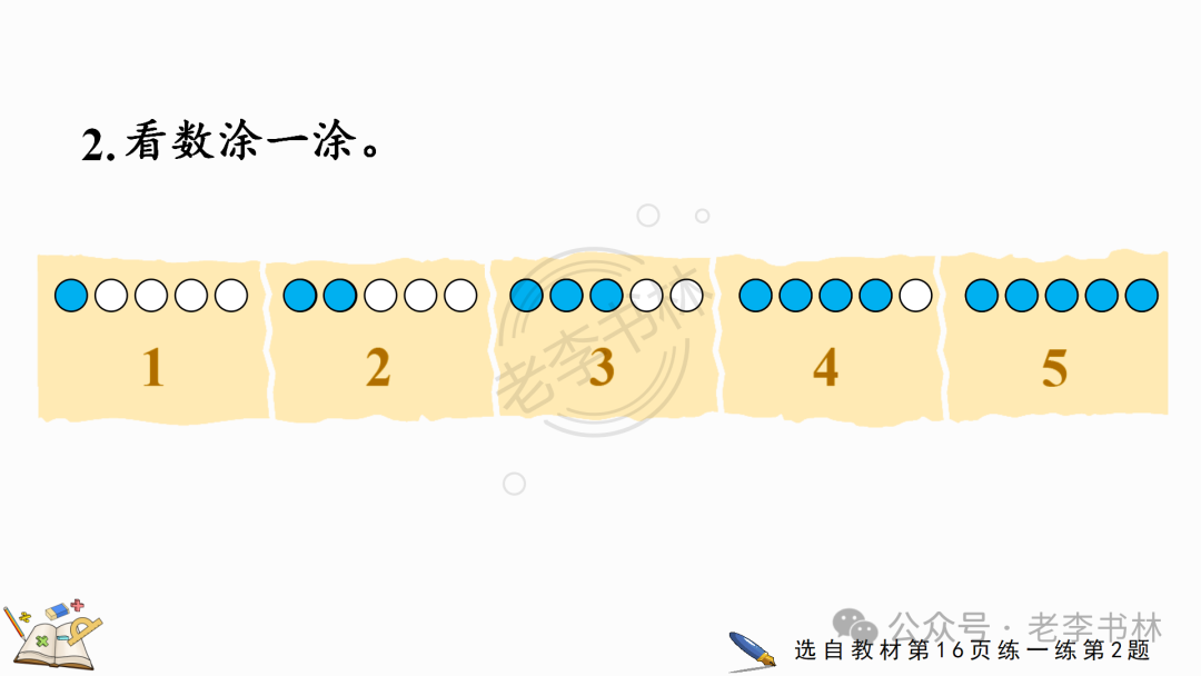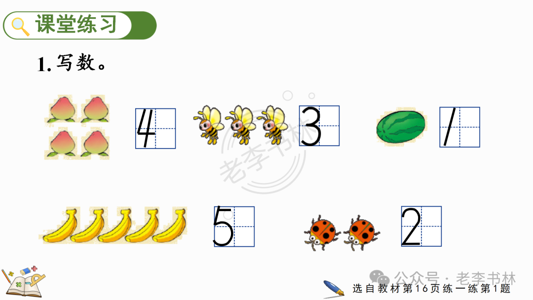 这节课同学们对数数和1-5的写法掌握的很好,下面我们来练习一下。