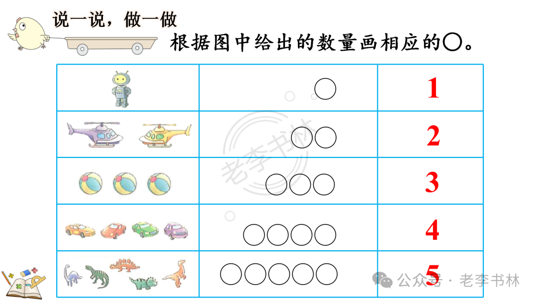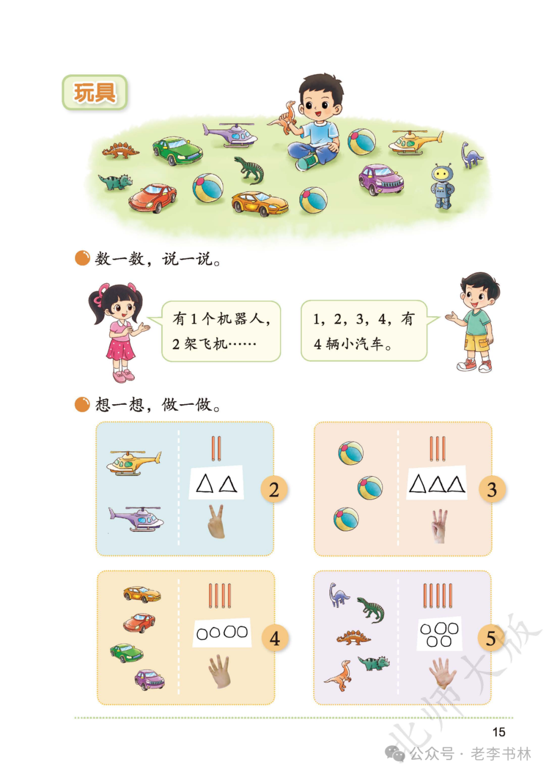 1、用图形或学具表示物体的个数,如果我们用1个园片来表示1个布娃娃,用2个园片表示2个人,那么谁知道3个皮球该怎样用圆来表示?4辆小汽车该怎样表示呢?5块积木呢?除了用圆表示物体的个数,我们还可以用小棒、三角形、五角星、还有你喜欢的各种图形、各种学具,来表示物体的个数。