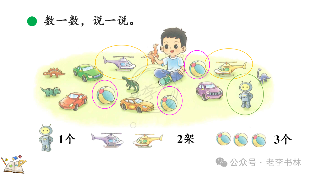 2、他们在玩些什么玩具?请你数一数、说一说,引导学生说出图上的物体