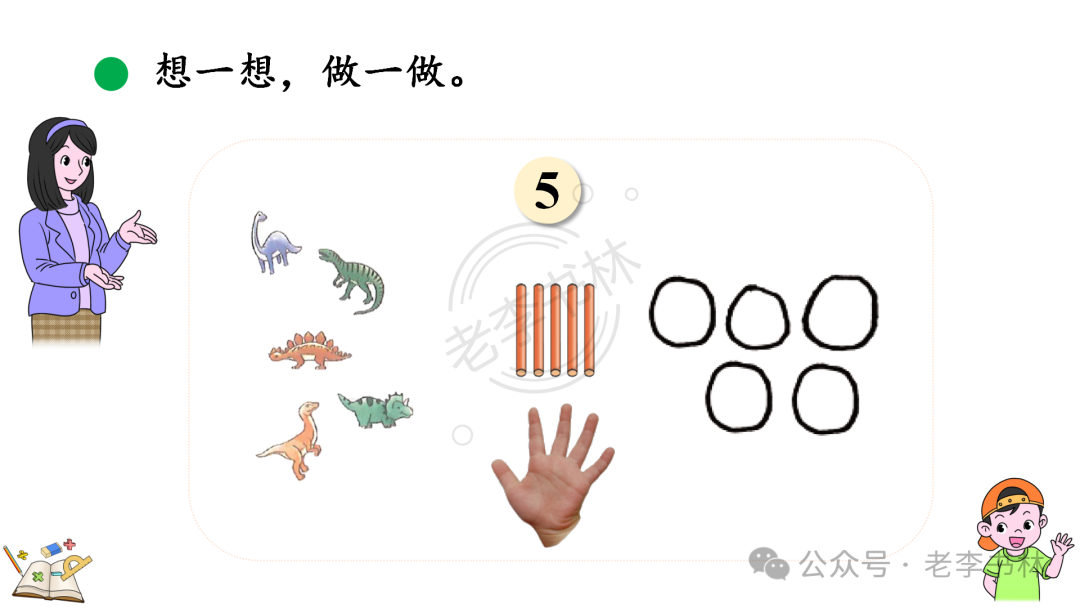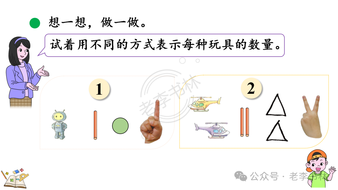 师问:前面我们学会了数数,学会了用不同方法表达物体的数量。那么你们