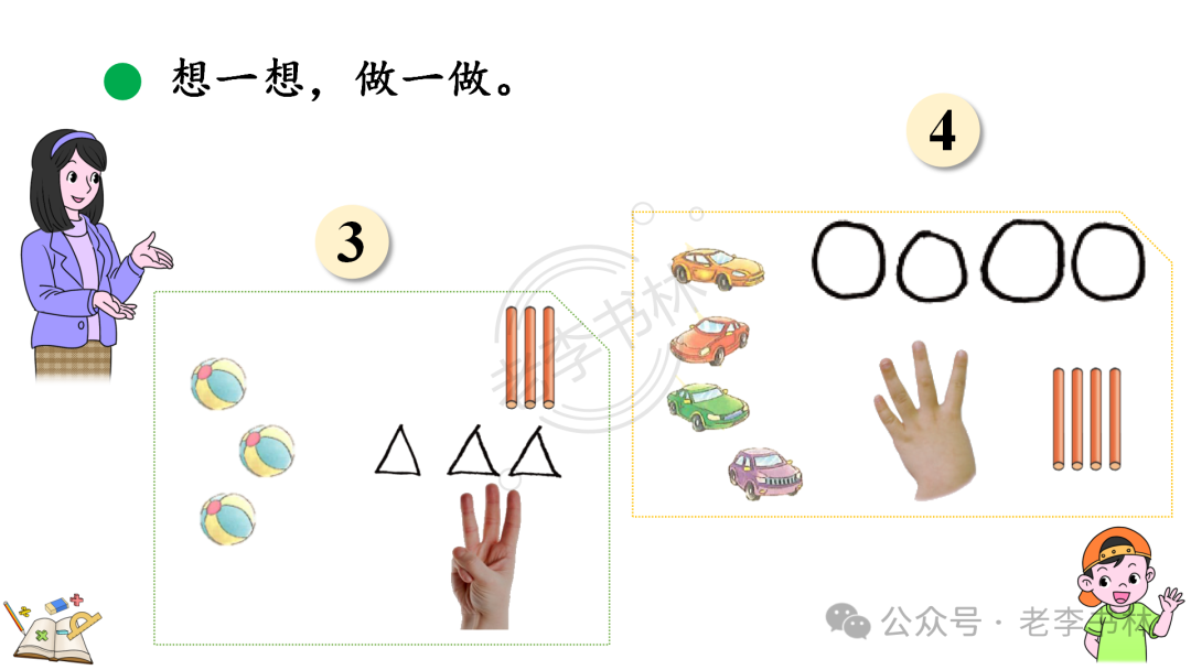 师:同学们继续看大屏幕,屏幕上有4辆小汽车,他们用了4个小棒来表示、