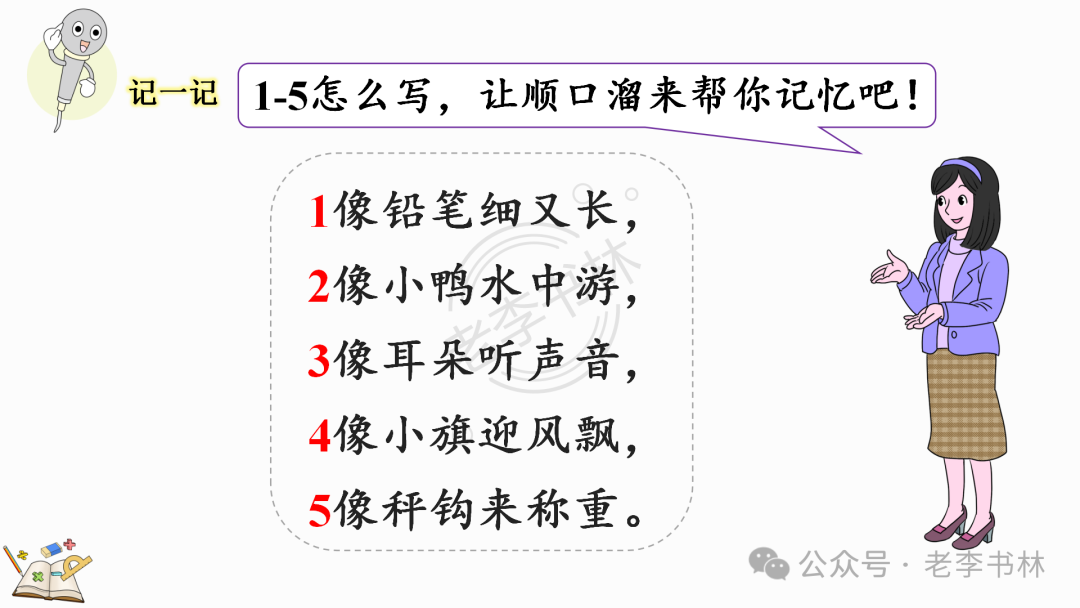 1像铅笔细又长,2像小鸭水上漂,3像耳朵听声音,4像红旗迎风飘,5像秤钩来买菜。