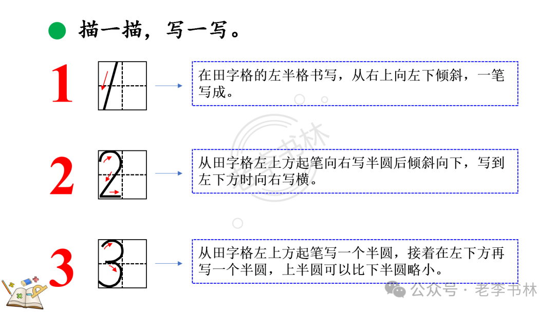 师:也就是告诉你一个起笔的方向,对不对。再往下看3呢?有没有起笔的