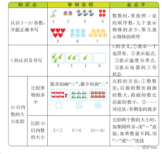 本单元学生学习的内容主要是数10以内物体的个数及如何用数的形式表示10以内物体的个数,这些内容安排在6个情境活动之中。“快乐的家园”重点要解决的问题是将直观的数数与数的表示方法结合起来;“玩具”与“文具”两个情境活动是学习1~10各数的书写;“小猫钓鱼”则是认识与书写“0”;“快乐的午餐”和“动物乐园”则是通过一一对应的关系学习“同样多”“多”“少”的含义,为下一单元学习“比较”打基础。其主要知识点: