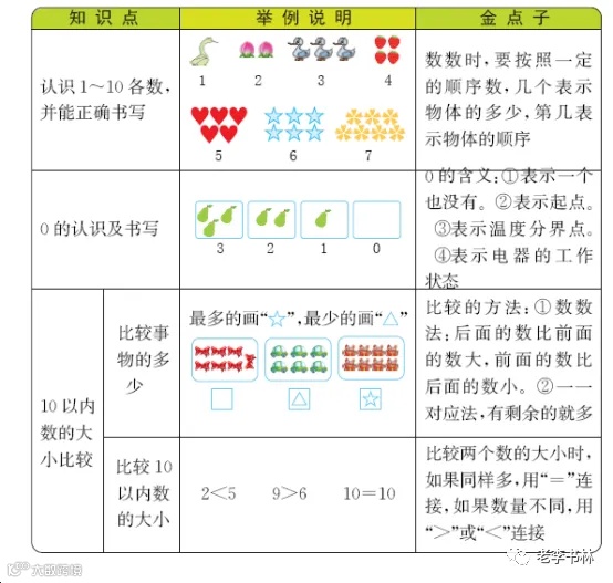 本单元教材贯穿着10以内数的数数、认数、读数、写数等基本活动,这些活动从形式到内容不拘一格,富有童趣,既能让学生获得知识、掌握技能,又能使学生获得对数学良好的情感体验。在习题的设计上,注意渗透集合与对应的数学思想,也关注学生计数(顺着数、倒着数、跳着数)技能的提高与数感的发展。
