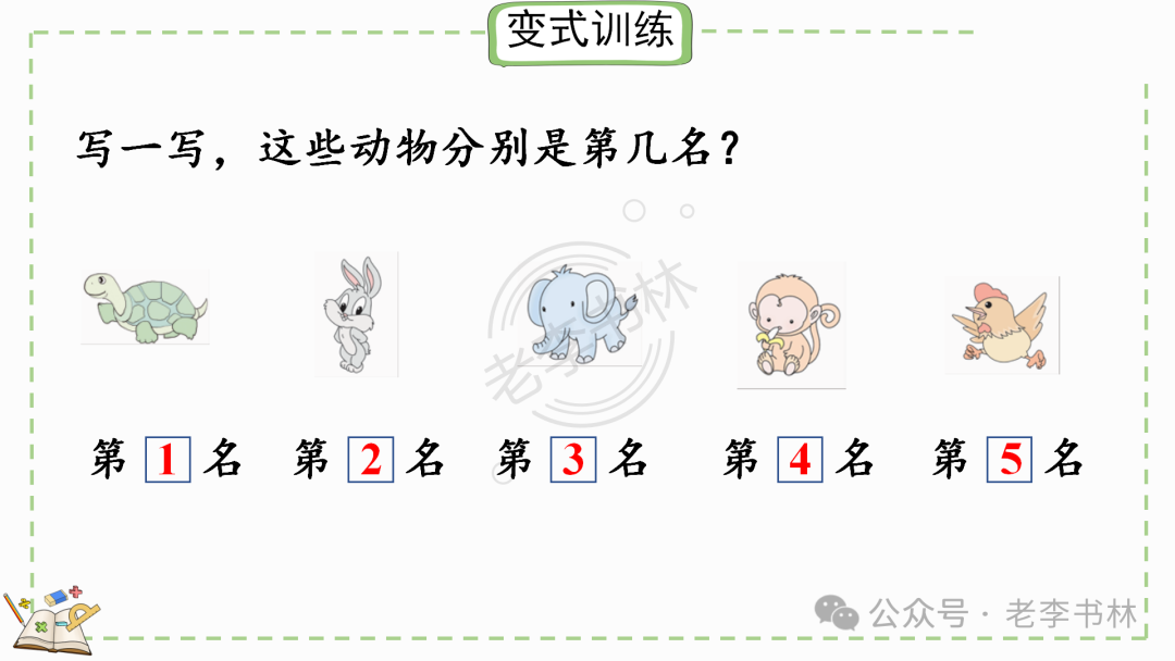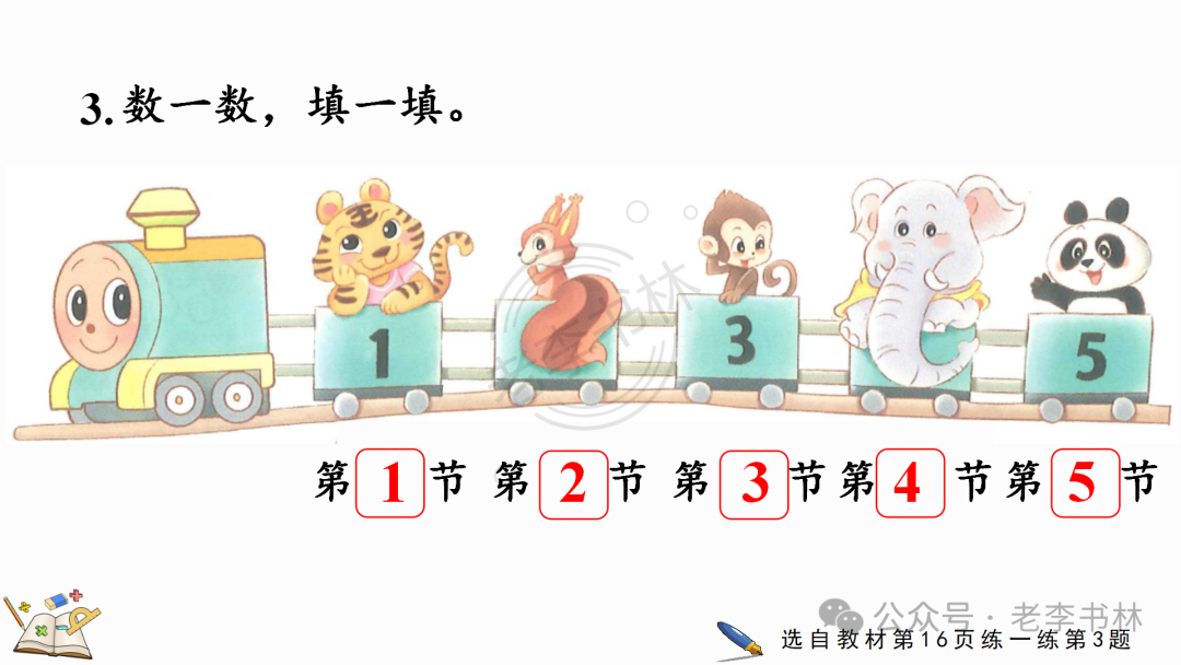 生:一共有5节车厢,车厢上有老虎、松鼠、大象、小猴子、大熊猫。 师:老虎的车厢上写着个1,是表示1只老虎吗? 生:不是。是表示第一节车厢。