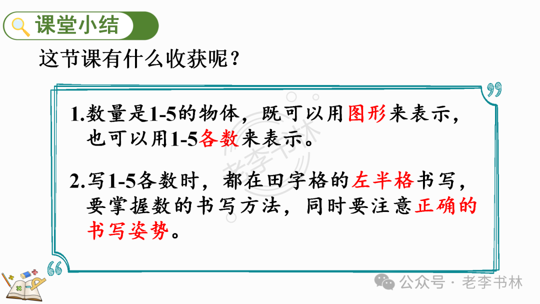 今天,我们不仅认识了数字宝宝1、2、3、4、5,学习了它们的读法和写法,还知道了数字不仅可以表示物体的个数,还可以表示位置和顺序。
