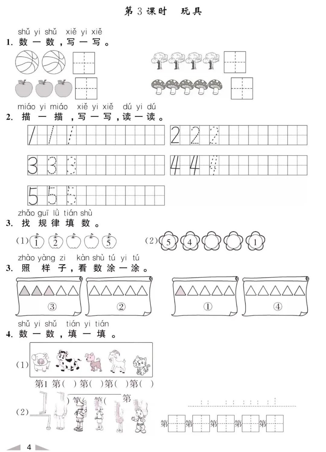 练习2:数一数,画一画,写一写。 练习3:看数涂一涂。 练习4:数一数,填一填。