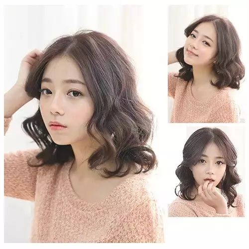 中分刘海轻松瘦脸,棕色蛋卷烫搭配上粉色系妆容让女生变得清甜。