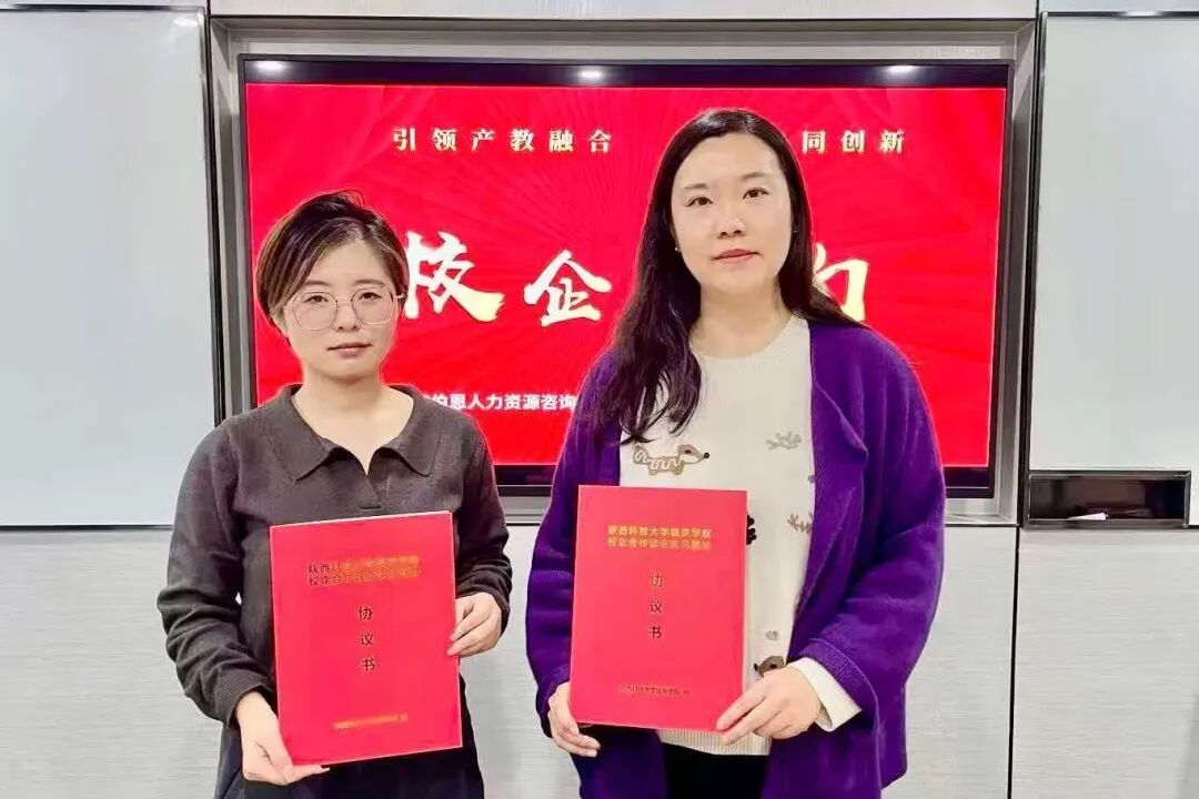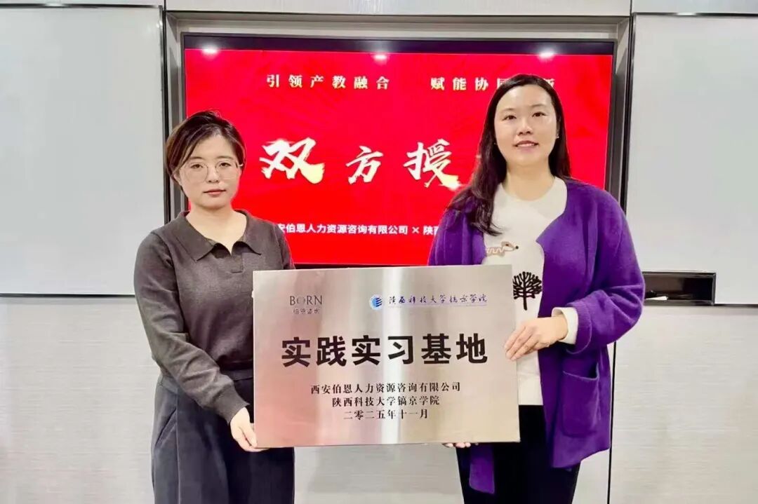 2025年11月7日,陕西科技大学镐京学院人力资源管理专业教研室专任教师杨琪、张晨与西安伯恩人力资源咨询有限公司业务负责人李夏、项目经理李庆慧、人事专员许文杰共同出席实习基地签约授牌仪式,正式开启双方在人力资源专业人才实践培养领域的深度合作。