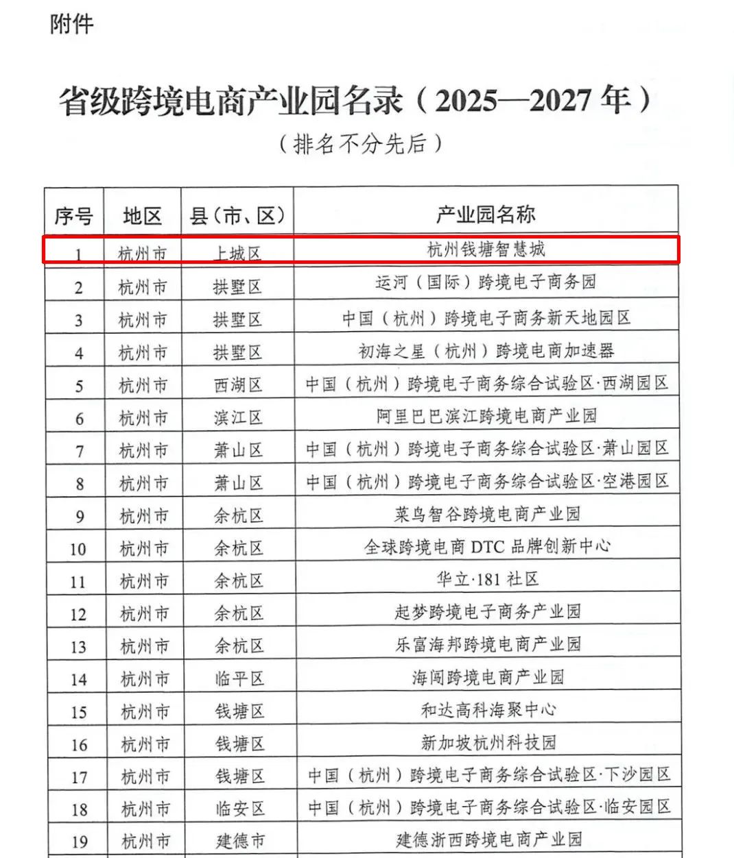 为促进“直播+平台+跨境电商”三位一体融合发展,打造一流跨境电商发展生态,根据《浙江省加力推动跨境电商高质量发展行动计划(2024-2027年)》部署和商务部相关文件精神,近日,浙江省商务厅正式公布了省级跨境电商产业园名录(2025-2027年),杭州钱塘智慧城名列其中!