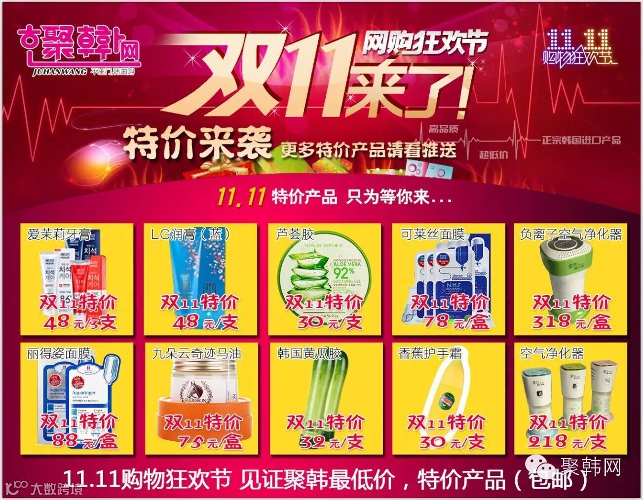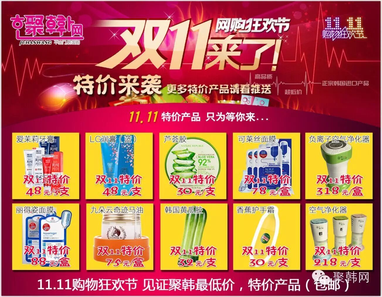 聚韩网双十一感恩回馈,全场大量商品特价出售,史无前例见证最低价!11.11活动发货时间7个工作日内,按下单顺序依次发货,请勿催促。