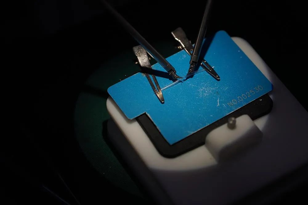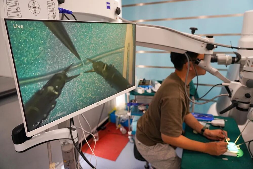 显微镜前,研发人员凝神屏息,操作两只机械臂,在一根如头发丝般细的仿真血管上“穿针引线”。随着机械臂的移动、套接、吻合,断开的仿真血管实现了“无缝衔接”。近日,在位于杭州钱塘智慧城的杭州迪视医疗生物科技有限公司(以下简称“迪视医疗”)实验室,一场由显微外科手术机器人参与的模拟手术正在进行。