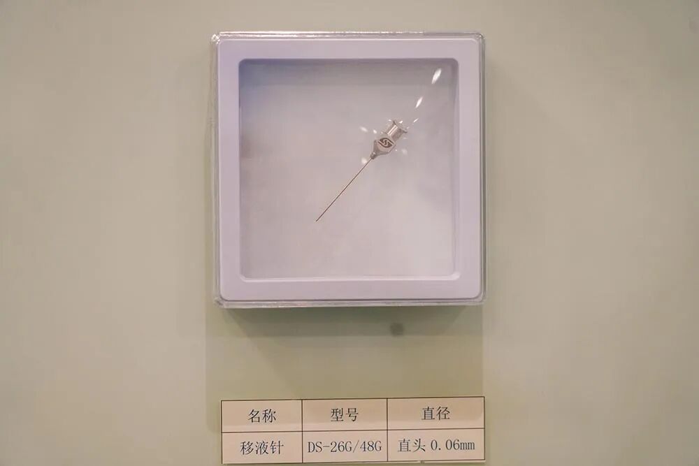 目光移至实验室的另一侧,墙面上挂着3组微针模型。这些特制手术针头能与手术机器人的机械臂完美配合,实现微米级精准操作。模拟手术时,只见研发人员坐在机器控制台旁,右脚踩着踏板,手轻轻移动控制杆,精巧的机械手臂便随着控制杆前后移动。一旁的大屏幕上,精准显示出针头的注射位置。