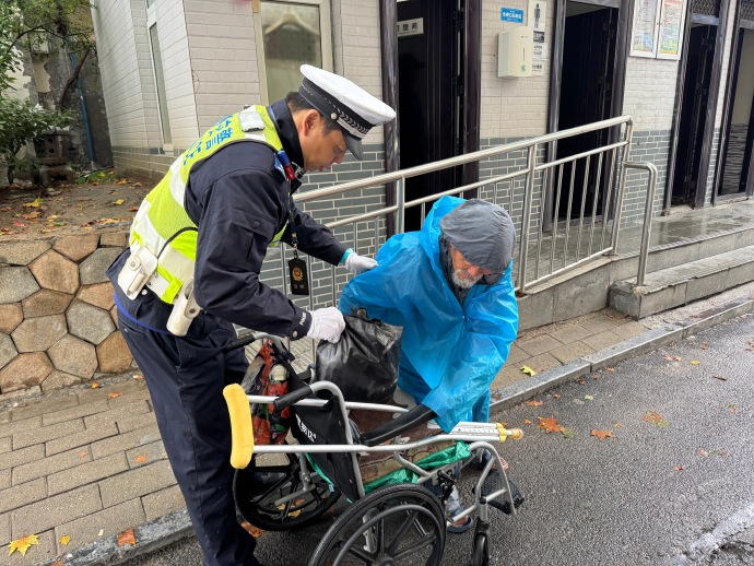 10月2日,在人民公园东门,一位坐轮椅的残疾老人面露焦急。正在执勤的交警四支队民警瞧见后,赶忙上前。了解到老人因轮椅不便难以如厕,民警小心搀扶并帮了忙。之后,民警又询问老人去向,随即变身 “护航员”,稳稳推着轮椅,把老人安全送过马路。面对老人的再三感谢,民警只是朴实回应 “这是我们该做的”,便匆匆回到岗位。