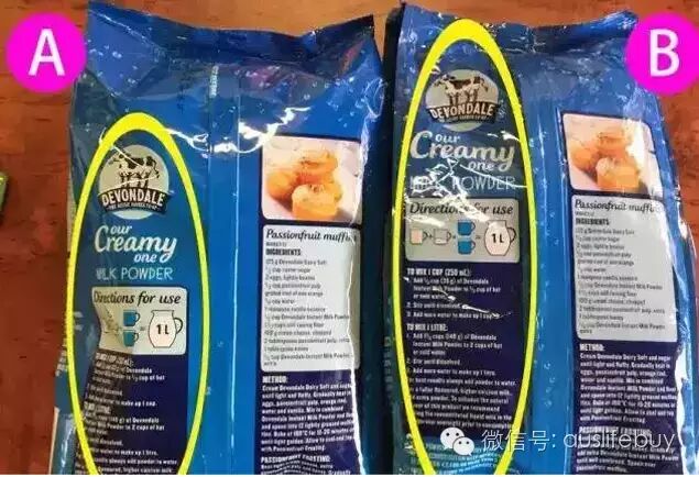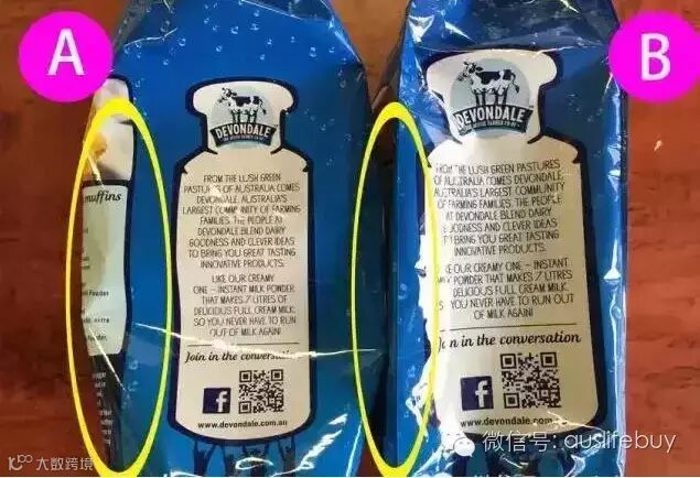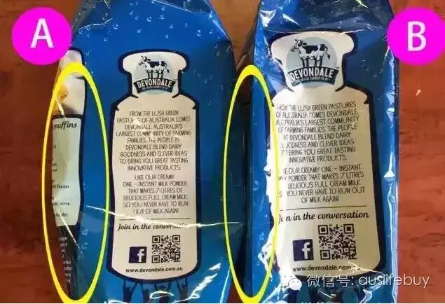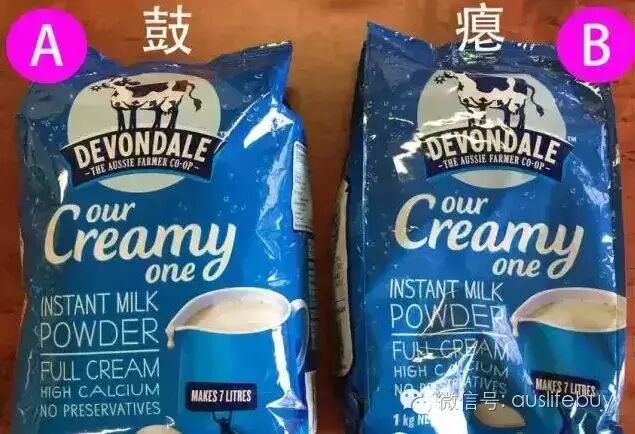 下面这2袋就是网上的所谓的”鼓袋“和”瘪袋“,为了方便大家鉴别,分别是用A和B来标注两袋德运全脂奶粉。