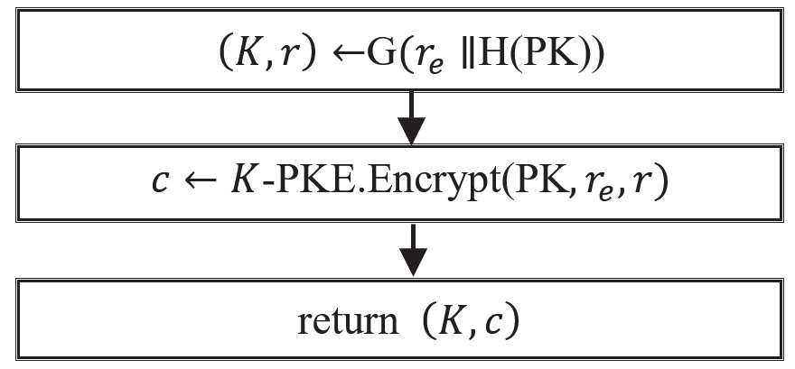 (2)密钥封装算法。密钥封装算法是实现安全通信的关键步骤之一,该算法利用公钥生成一个会话密钥及其对应的密文,这一过程称为封装。接收方随后使用私钥对密文进行解封装,以恢复相同的会话密钥。这种机制不仅保证了通信双方能够安全地共享密钥,还可以优化密钥大小和计算效率。本方案密钥封装算法采用(K,C)←EnCapPK(re)。输入封装密钥PK和一个随机数re∈RSE,输出会话密钥K∈KS和一个密文空间C∈CS,这里RSE是一个随机数空间,KS表示一个会话密钥空间,CS表示一个密文空间。密钥封装EnCap(PK,re)算法流程如图4所示。