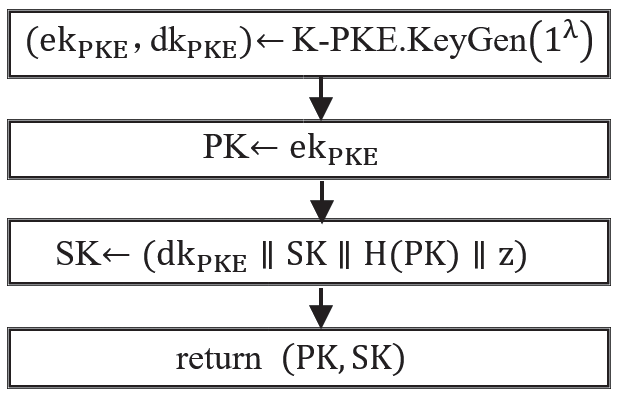 后量子密钥封装算法旨在提供安全的密钥交换机制,网上交易后量子密钥封装算法模块由密钥生成算法、密钥封装算法和解封装算法三个算法(KeyGen、EnCap、DeCap)组成,K-PKE.KeyGen、K-PKE.Encrypt、K-PKE.Decrypt为密钥封装算法对应的密钥生成和加解密算法。