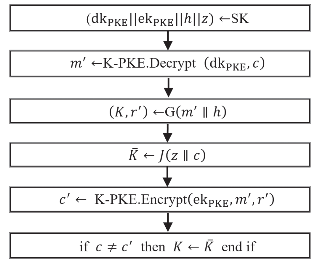 (3)密钥解封装算法。密钥解封装算法利用私钥对密文进行解密,从而恢复出与封装算法生成的相同的会话密钥。本方案密钥解封装算法采用K/⊥←DeCapSK(C)。解封装算法输入解封装密钥SK和密文C∈CS,输出会话密钥K∈KS或者一个拒绝符合⊥。密钥解封装DeCap(SK,c)算法流程如图5所示。
