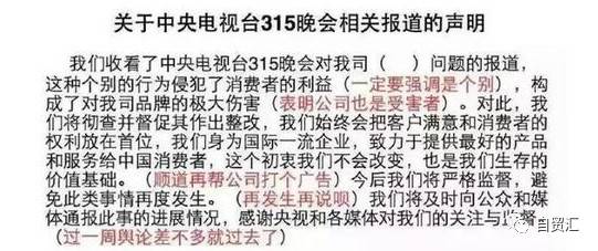 ⊙最后,被曝光的企业如何应对315,那也是很有讲究的。既考验了“公关”的处理速度,又得让广大老百姓接受。于是乎,这篇关于道歉的通稿可能又要出现在我们的眼前了...