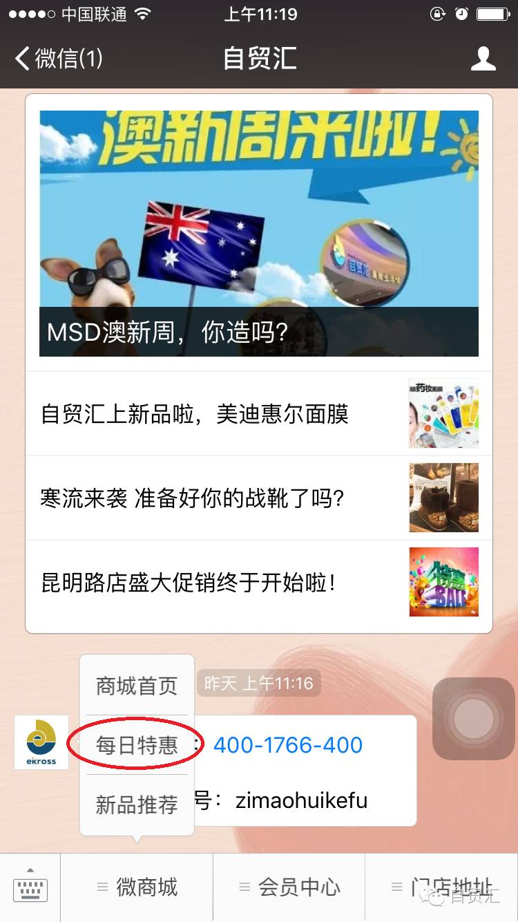2、其次就是进入自贸汇公众号,点击底部菜单“微商城”里面的“每日特惠“菜单,即可进行购买。