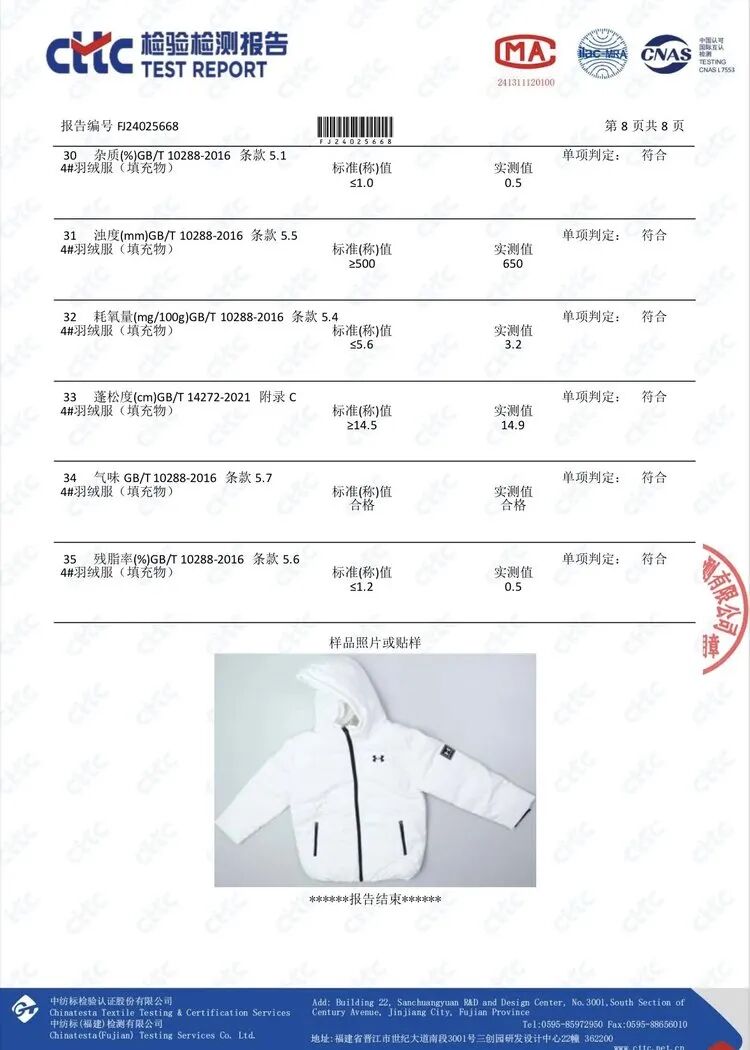 安德玛的长款羽绒服的充绒量在80%,110码的充绒量就达到了126g,170码的更是达到了258g,再加上这个价位,妥妥的良心品牌啊!