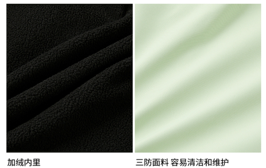 这款三防冲锋衣,内里加绒,是可以从深秋穿到冬天的厚度,特别实穿!三防面料,防污防油防泼水,特别容易清洁,平时用湿布一擦即可。