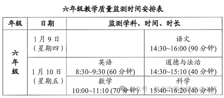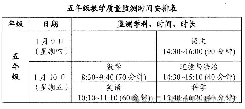 监测科目:语文、数学、英语、道德与法治、科学。