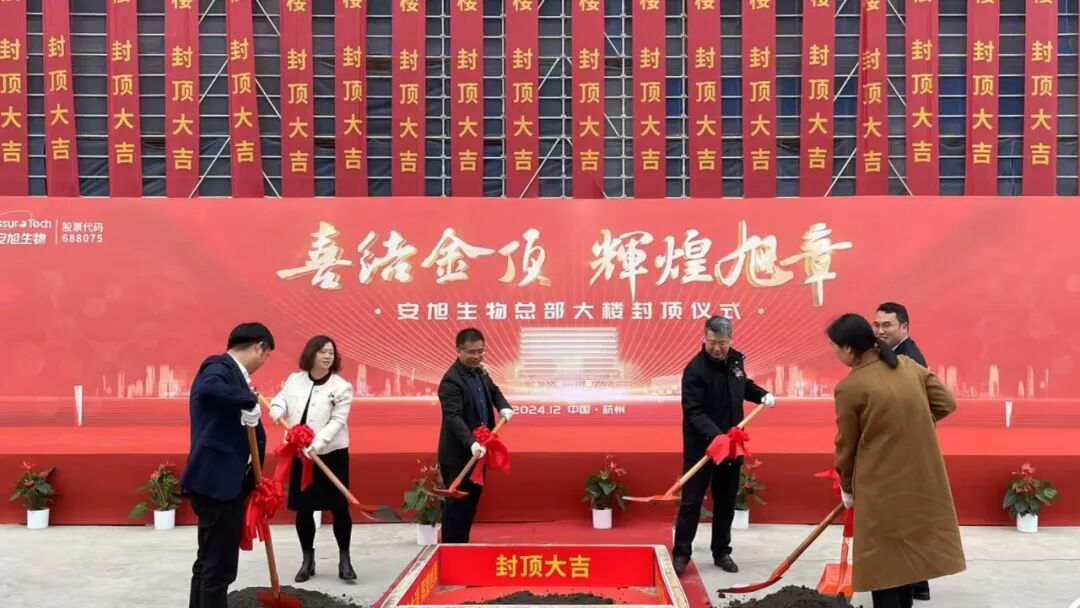 12月3日,安旭生物总部大楼顺利结顶。钱塘智慧城党工委副书记、管委会主任王剑,智慧城党工委委员、管委会副主任朱勤华等出席仪式。