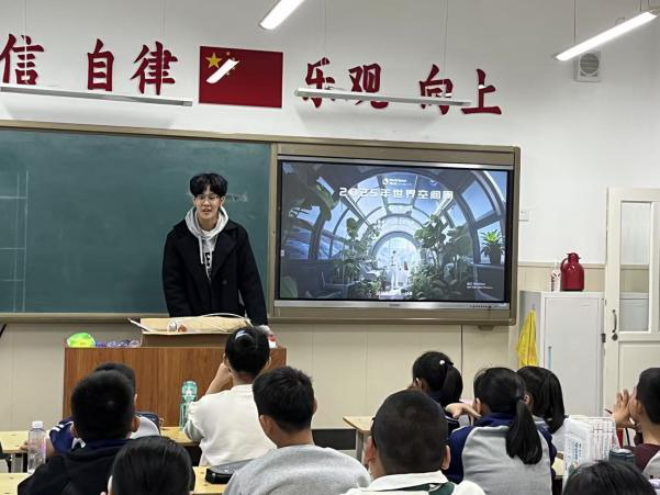 在爱建小学的课堂上,哈工大学生分会主席杜德嵩带领团队成员为孩子们讲述了中国航天的发展历程,从“东方红一号”的奏响到探月工程的辉煌成就,再到载人航天、空间站建设的壮丽征程。活动中以“太空生活”为主题,带领孩子们探讨航天员如何在中国空间站内吃饭、睡觉、锻炼和实验,让孩子们近距离感受“在太空中生活”的奇妙与艰辛。课堂气氛热烈,孩子们热情提问、踊跃互动,课堂在科学与想象交织的欢声笑语中圆满结束。