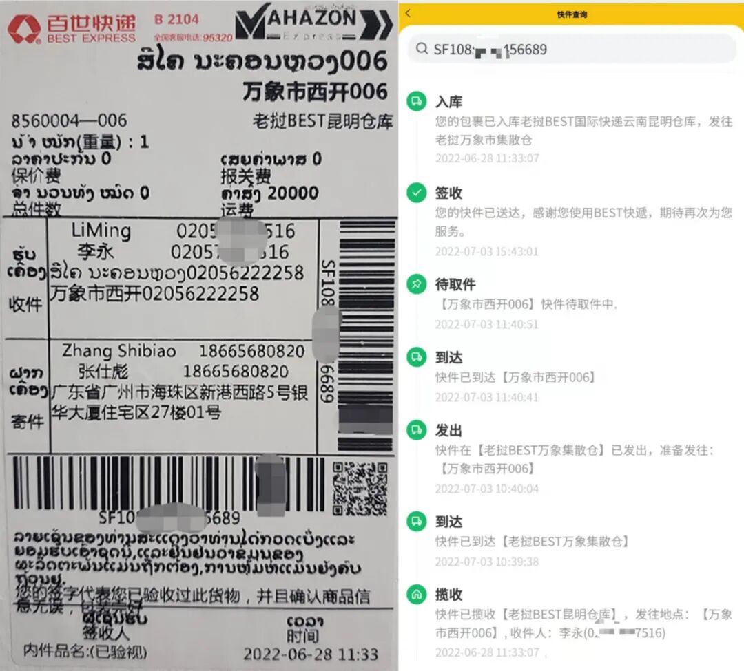 老挝各个角落都可自由取快递,在老经商各位华人老板有福了,百世BEST国际与玛哈松MHZ快递合并运营,老挝国内拥有200多个网点所有省县内都可到达,百世国际自2018年陆续开通泰国、越南、马来西亚、新加坡、柬埔寨的B2跨境寄递业务,通过海陆空运多种模式满足市场需求。集运服务同样覆盖上述五国,2022年4月1日开通老挝,为东南亚消费者大批量“海淘”中国产品提供便利。老挝百世国际、玛哈松快递招代理加盟商,咨询详情请扫描二维码添加微信或WhatsApp+8562022267777(建议使用WhatsApp)