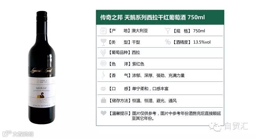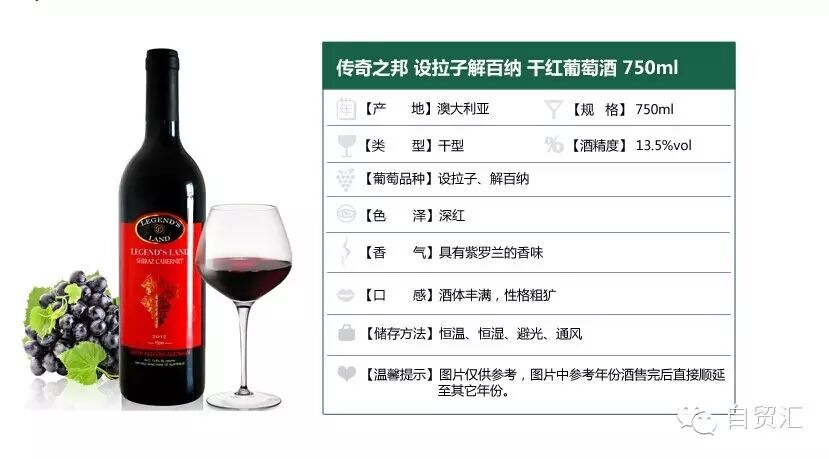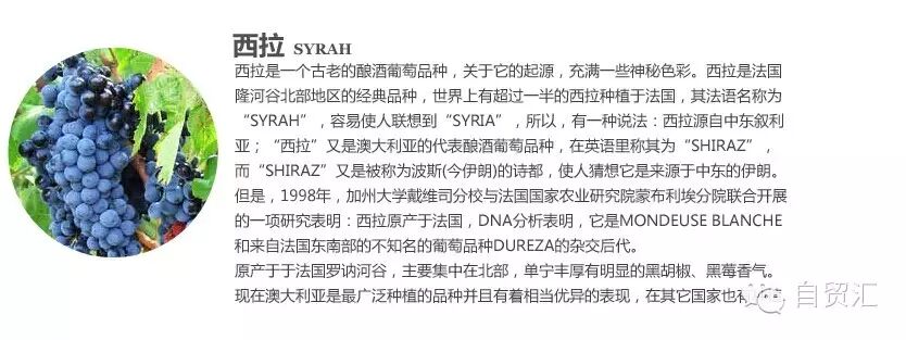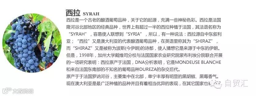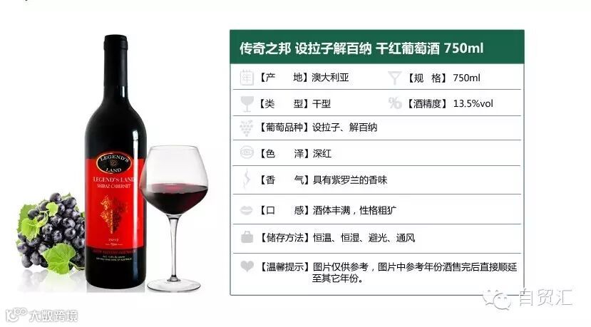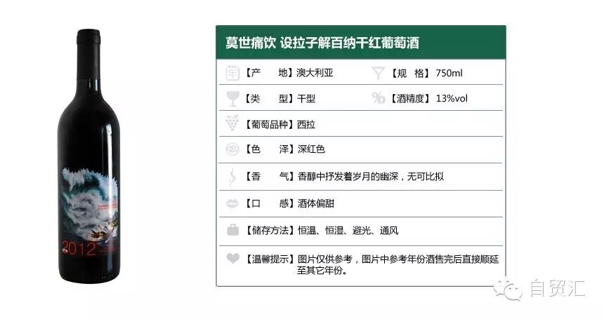 商品描述:这是一款口感非常丰富的红葡萄酒,在酒比较年轻的时候具有紫罗兰的香味,随着酒龄的增加而形成类似巧克力、烟熏及咖啡的香味,色泽深红,酒体丰满,性格粗犷,其特殊的风味于中国菜味、重油腻刚好适合,更适合与烧烤、干锅等配合。这款酒受到所有人的喜爱与追捧。西拉是澳大利亚最早广泛种植并有着相当优异的表现的最知名葡萄品种,兼有赤霞珠和黑比诺的优点,既有类似于赤霞珠那样的强劲单宁和厚重口感,又有黑皮诺雅致、馥郁的果香,这就是纵横南北的西拉。