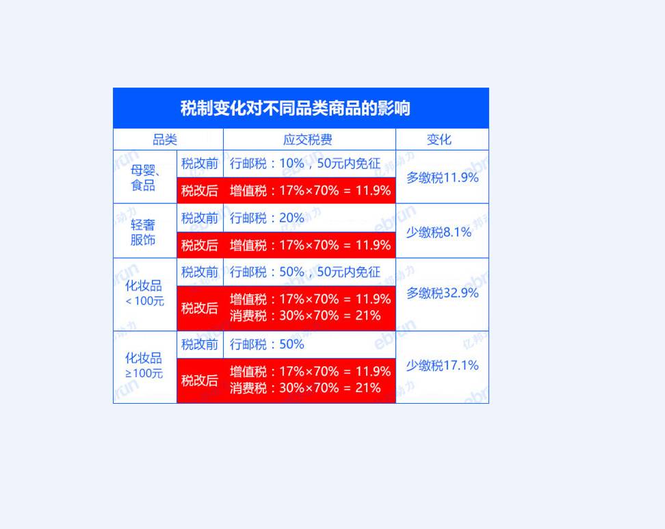 总体来说,新政执行后,绝大部分海淘商品的需缴的税会变多,但是也会有部分海淘“奢侈品”需缴的税反而变少。下面我们就来对比一下新政策执行后,海淘商品征收的税款的变化吧: