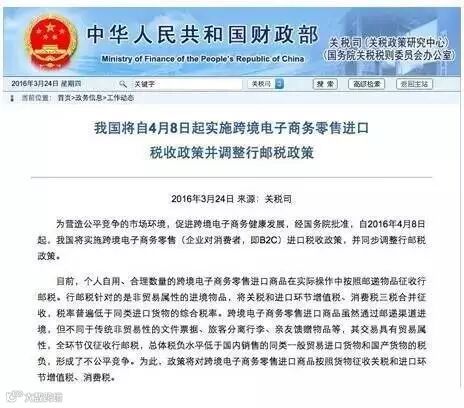 2016年4月8日起,我国将实施跨境电子商务零售(企业对消费者B2C)进口税收政策,并同步调整行邮税政策。这个消息在跨境电商尤其是海淘代购的圈子里一石激起千层浪。