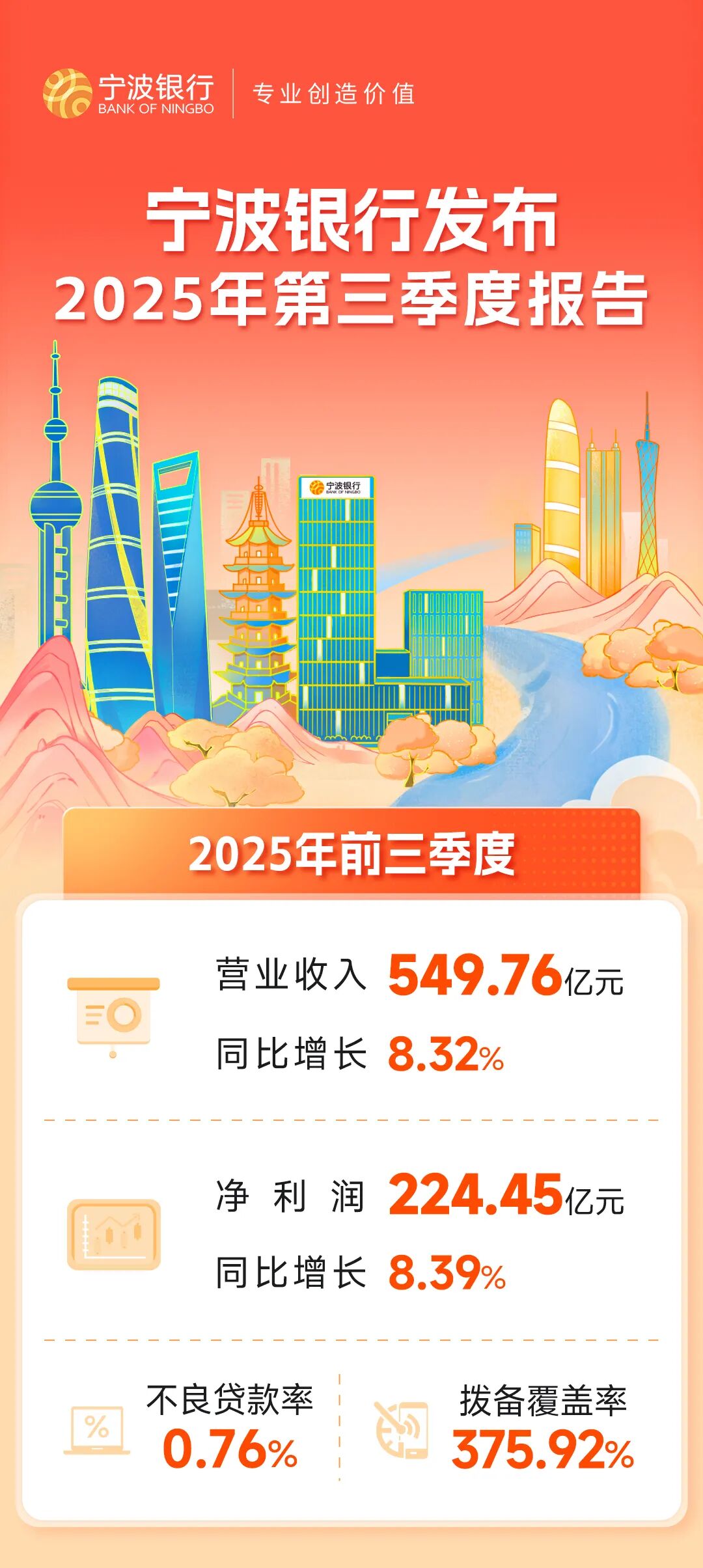 三季报数据显示,2025年1至9月,宁波银行实现归属于母公司股东的净利润224.45亿元,同比增长8.39%;实现营业收入549.76亿元,同比增长8.32%;年化加权平均净资产收益率为13.81%。