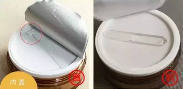 3.内盖中勺子的固定方式真假有别。掀开正品铝膜包装,可以发现位于内盖有个塑料易掀口和一把半透明的勺子,而翻开假货包装的时候,却发现内盖是没有易掀口设计。以及假货的勺子和正品的勺子形状是不同的,正品有一凹陷的端头设计,假货侧没有这一凹陷设计,造型简单不好用。