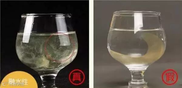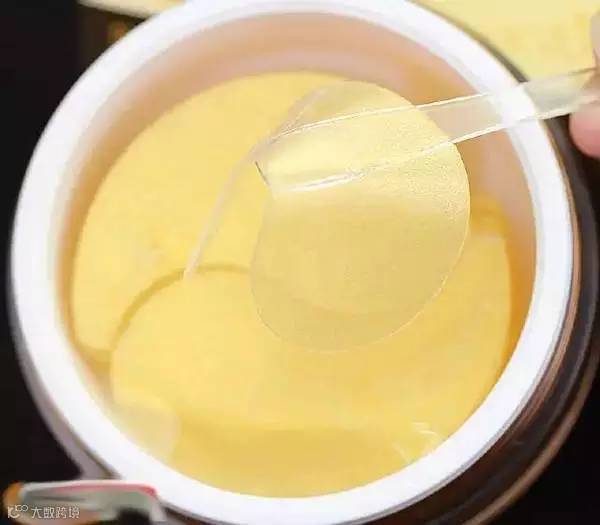 4.融水性能对比,假货几乎不能融水。融水性是正品贵妇眼膜贴的必备特点,实测中把正品眼膜放入70摄氏度左右的热温水中搅拌,可以还原溶解成原液眼膜,溶解性能是明摆着的,这样子融开的液体还可以当爽肤水用,所以亲们敷完眼睛,千万别扔了眼膜贴哦,把它用温水浸泡,就会融化了,融化下来的可都是精华,你可以用来洗脸,洗完脸如果还 怕浪费,那就接着再泡脚吧;对比之下,把假货的眼膜放进去温水后,无论怎么搅拌,都不见眼膜会溶解,像皮硅胶一样,质量不敢恭维。