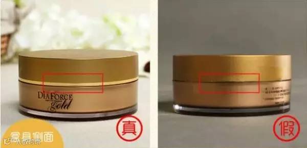 2.在瓶身的侧面,注意上面加了红框的位置,区别已经相当明显。正品的盒装侧面盖子边缘是有一条金边,镶金了,一下子配得上黄金眼膜的称号,真是高端大气上档次的包装;而假货的盖子边缘却少了这条金边,为普遍的塑料边,而且这条边还处理的毛毛糙糙,工艺质量较次。