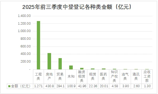 商业保理资产证券化产品运用第一的是工程类应收账款。2025年前三季度,登记转让金额达到1271.93亿元,登记金额占比为57.96%,同比增加了127.84亿元。
