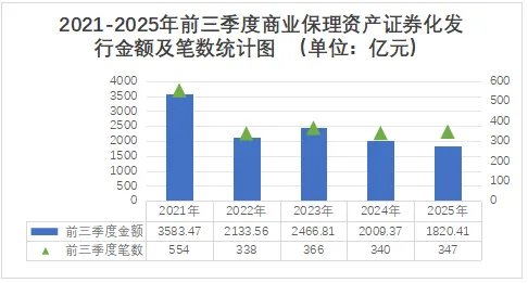 2025年前三季度,商业保理资产证券化累计发行1820.41亿元,同比下降9.4%;发行347笔,同比上升2.06%;单笔平均发行规模5.25亿元,同比下降11.23%。