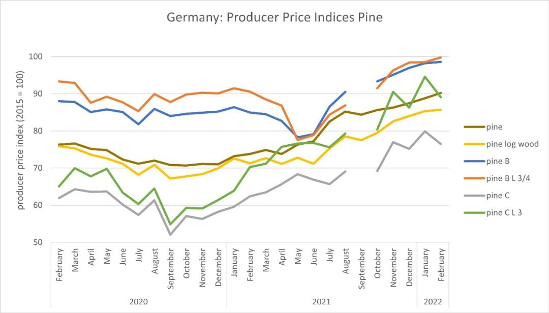 松树指数同比上涨20.2%。B级范围增加了16%——在3到4m 的长度范围内增加了 10.2%。与2021年2月相比,C级增长了 22.6%。3m长度增长了 26.7%。松浆材比去年同月指标水平高出29.4%。