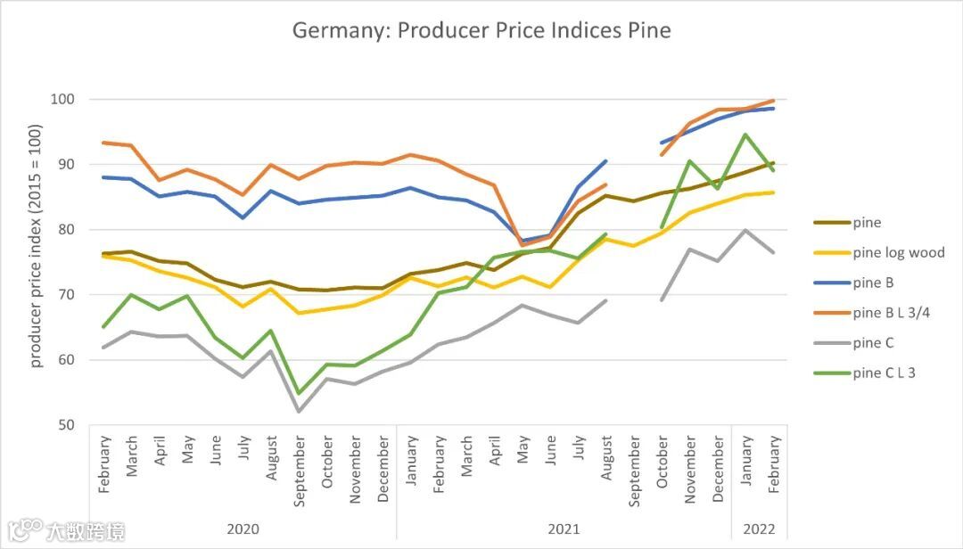 2022年2月,德国松木的价格指数大多继续上涨。与1月份相比,原木平均上涨0.5%,达到 85.7 点的水平。B级提高0.4%至98.6点。3/4m长度增加了1.3%至99.8个点。