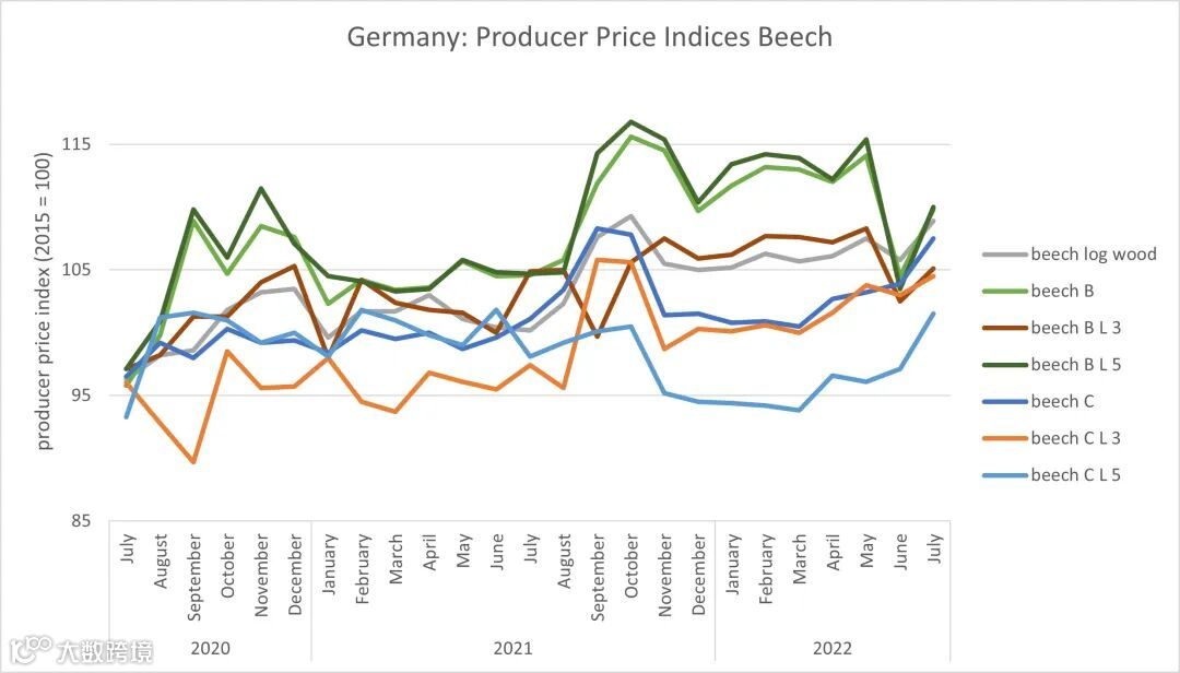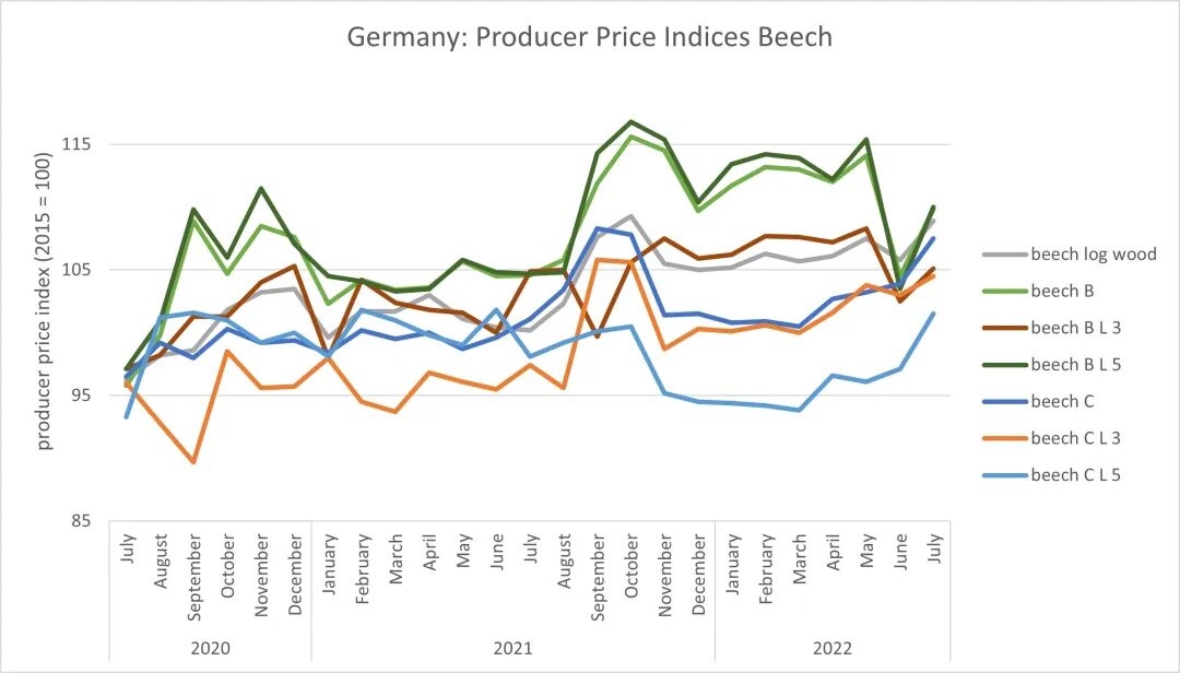 2022年7月,德国榉木原木价格指数大幅上涨。平均而言,它们上涨了2.9%,达到108.9点。B级环比上涨5.1%,至109.8点。3米长度的指数上升了2.5%至105.1点,而5米长度的指数上升了6.3%至110点。