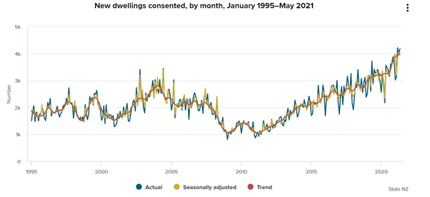 新西兰冬季对原木和锯材的需求没有减缓。新西兰新住宅的同意书继续呈上升趋势。新住宅许可证如下图所示。截至5月底,同意书的数量和价值分别比上一年增长17%和21%。这在北岛非常明显,奥克兰的同意书增长了28%,北岛的其他地区增长了24%。坎特伯雷股市上涨13%,而南岛其他股市下跌4%。