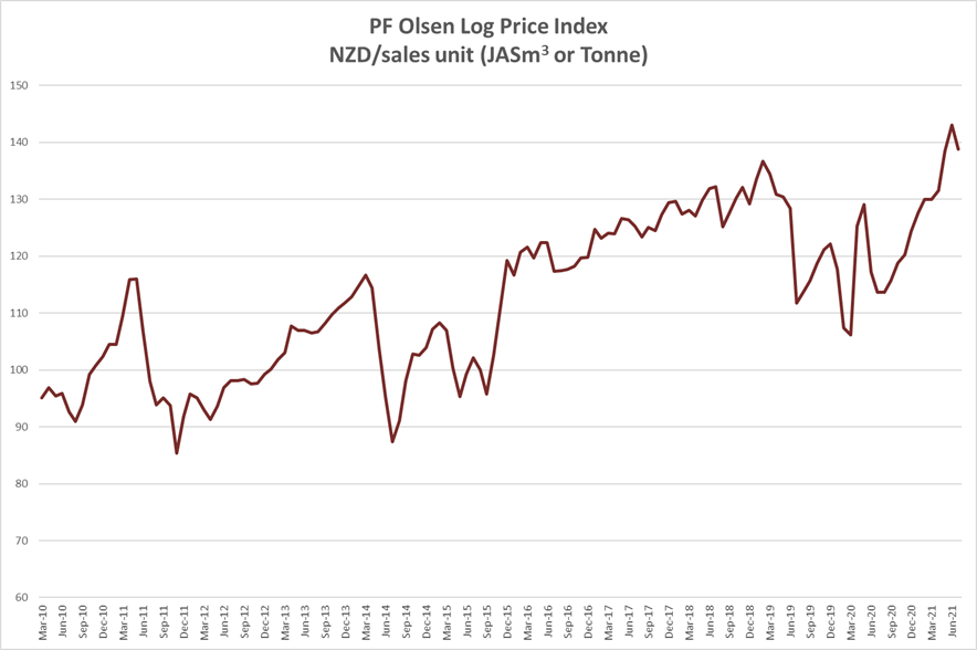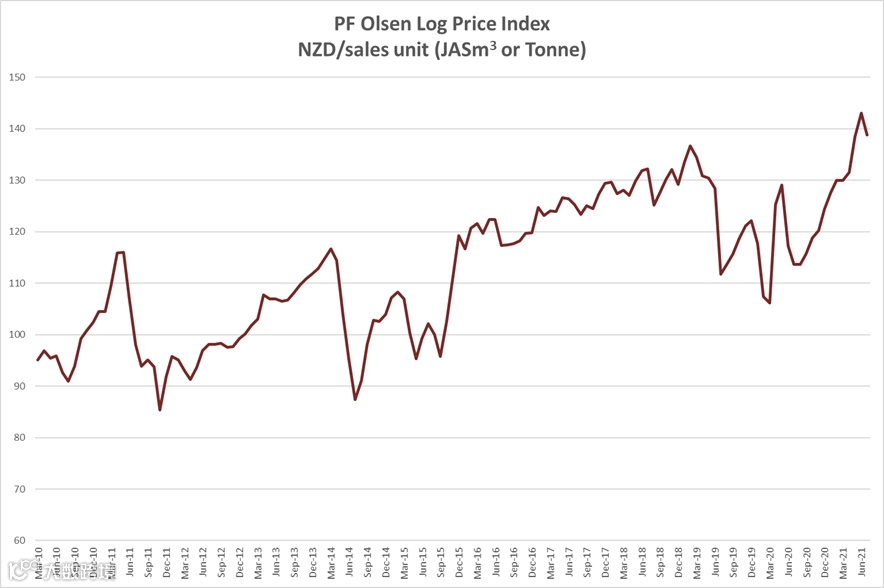 指数依据:该指数基于下表中的价格,按比例加权,代表典型修剪森林生产的原木等级的广义平均值,约40%为新西兰国内供应,60%为出口供应。