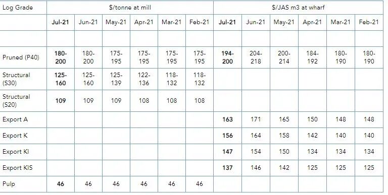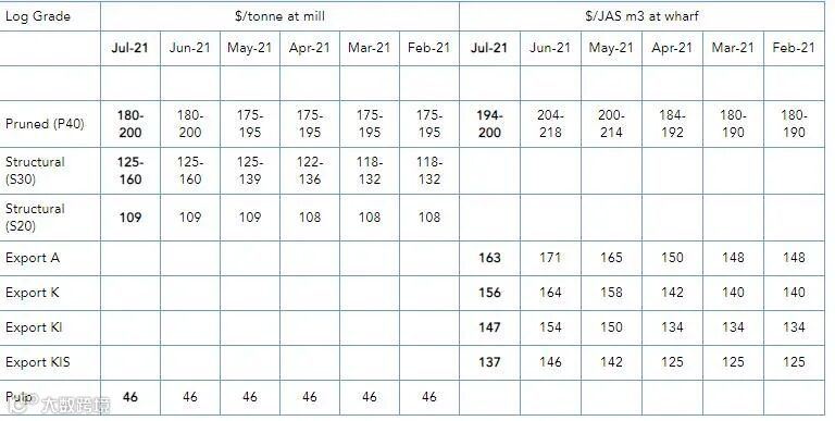 7月份AWG原木价格比6月份的价格平均下降了8-9美元/m3(jas检尺)。由于吉斯伯恩港口拥堵而产生的滞期费影响了AWG原木价格,因此,不同的地理位置,价格差异很大。原木出口商的AWG定价也有不同。