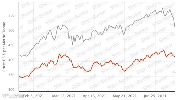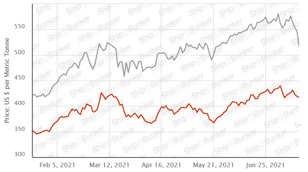 Singapore Bunker Price (IFO380) (red line) versus Brent Oil Price (grey line)